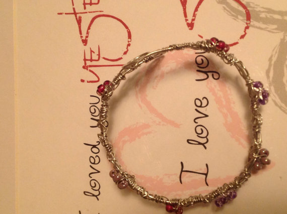 Its a wonderful wrapped wire. Seed beads that look like grapes on a vine. Nice delicate twists of wire. This bracelet is 9″ will fit most wrist.